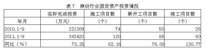 據(jù)國家統(tǒng)計(jì)局公布的數(shù)據(jù),2011年1-9月份麻紡行業(yè)實(shí)際完成投資額38.34億元,同比增加73.25%;當(dāng)年以來到目前為止施工項(xiàng)目總數(shù)為120個(gè),同比增加62.16%;其中新開工項(xiàng)目數(shù)88個(gè),同比增加76.00%;截至9月底為止,已實(shí)現(xiàn)竣工項(xiàng)目數(shù)60個(gè),同比增加130.77%,占施工項(xiàng)目總數(shù)的50.00%,表明該行業(yè)投資項(xiàng)目進(jìn)展較好。