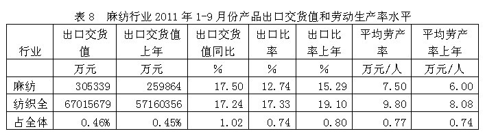 從行業(yè)產(chǎn)品出口交貨值和勞動(dòng)生產(chǎn)率水平看,2011年1-9月份麻紡行業(yè)產(chǎn)品出口交貨值為30.53億元,占紡織全行業(yè)的0.46%;出口交貨值比上年同期增加17.50%;該行業(yè)產(chǎn)品出口比率(出口交貨值/工業(yè)銷售產(chǎn)值)為12.74%,而上年同期為15.29%,表明該行業(yè)產(chǎn)品出口狀況較好;從勞動(dòng)生產(chǎn)率的水平看,2011年1-9月份麻紡行業(yè)平均勞產(chǎn)率(工業(yè)增加值/從業(yè)人數(shù))為7.50萬元/人,而上年同期為6.00萬元/人,表明該行業(yè)勞動(dòng)生產(chǎn)率的實(shí)際水平較為理想。