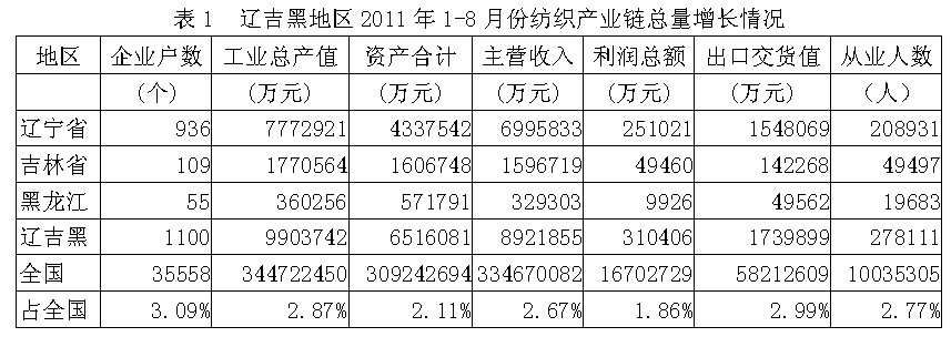 據(jù)國(guó)家統(tǒng)計(jì)局公布的數(shù)據(jù),2011年1-8月份我國(guó)遼吉黑三?。ㄟ|寧省、吉林省、黑龍江)紡織產(chǎn)業(yè)鏈(從紡織上游原料到下游服裝)規(guī)模以上企業(yè)數(shù)量為1100家,占全國(guó)總數(shù)的3.09%;工業(yè)總產(chǎn)值為990.37億元,占2.87%;資產(chǎn)合計(jì)為651.61億元,占2.11%;主營(yíng)收入為892.19億元,占2.67%;利潤(rùn)總額為31.04億元,占1.86%;出口交貨值為173.99億元,占2.99%;從業(yè)人數(shù)為27.81萬(wàn)人,占2.77%。由此可見(jiàn),遼吉黑地區(qū)紡織產(chǎn)業(yè)鏈總產(chǎn)值、總資產(chǎn)、主營(yíng)收入、出口和就業(yè)均給全國(guó)作出了一定的貢獻(xiàn)。