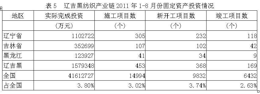 據(jù)國(guó)家統(tǒng)計(jì)局公布的數(shù)據(jù),2011年1-8月份遼吉黑地區(qū)紡織產(chǎn)業(yè)鏈實(shí)際完成投資額157.93億元,占全國(guó)實(shí)際投資總額的3.80%;當(dāng)年以來(lái)到目前為止施工項(xiàng)目總數(shù)為453個(gè),占全國(guó)施工總數(shù)的3.02%;其中新開(kāi)工項(xiàng)目數(shù)368個(gè),占全國(guó)新開(kāi)工項(xiàng)目總數(shù)的3.74%;截至8月底為止,已實(shí)現(xiàn)竣工項(xiàng)目數(shù)169個(gè),占全國(guó)已竣工項(xiàng)目總數(shù)的2.63%,占該地區(qū)施工項(xiàng)目總數(shù)的37.31%,表明該地區(qū)投資項(xiàng)目進(jìn)展較好。