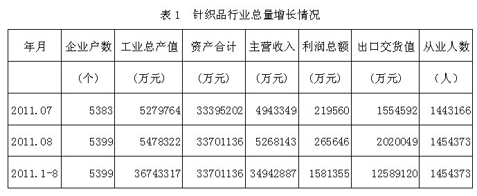 據(jù)國(guó)家統(tǒng)計(jì)局公布的數(shù)據(jù),2011年1-8月份我國(guó)規(guī)模以上針織品行業(yè)企業(yè)數(shù)量為5399家,該行業(yè)實(shí)現(xiàn)工業(yè)總產(chǎn)值3674.33億元,同比增加23.97%;資產(chǎn)合計(jì)3370.1億元,同比增加16.06%;實(shí)現(xiàn)主營(yíng)收入3494.29億元,同比增加24.16%;完成利潤(rùn)總額158.14億元,比上年同期增加32.29億元,同比增加25.66%;完成出口交貨值1258.9億元,同比增加15.39%;行業(yè)整體從業(yè)人數(shù)145.44萬(wàn)人,同比增加3.45%。由此可見,針織品行業(yè)總量增長(zhǎng)勢(shì)頭良好,并為我國(guó)經(jīng)濟(jì)、財(cái)政、出口和就業(yè)作出了重大的貢獻(xiàn)。