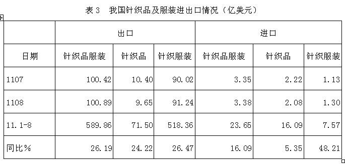 根據(jù)中國(guó)海關(guān)的統(tǒng)計(jì)數(shù)據(jù),我國(guó)2011年1-8月份針織品及服裝出口總額589.86億美元,同比增加26.19%,占紡織品及服裝出口總額1671.58億美元的35.29%;其中1-8月份針織品出口總額71.50億美元,同比增加24.22%,占紡織品出口總額669.53億美元的10.68%;1-8月份針織服裝出口總額518.36億美元,同比增加26.47%,占服裝出口總額1002.05億美元的51.73%;