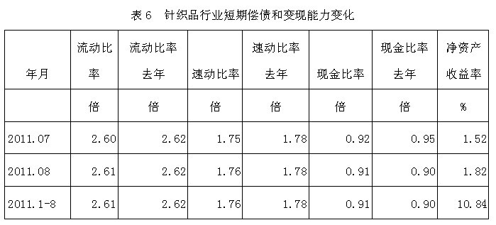 針織品行業(yè)資產(chǎn)負(fù)債率2011年1-8月份為56.71%,表明財(cái)務(wù)政策的運(yùn)作較為穩(wěn)??;凈資產(chǎn)收益率為10.84%,表明該行業(yè)凈資產(chǎn)運(yùn)作效率較高。