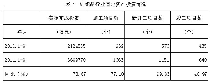 據(jù)國(guó)家統(tǒng)計(jì)局公布的數(shù)據(jù),2011年1-8月份針織品行業(yè)實(shí)際完成投資額368.98億元,同比增加73.67%;當(dāng)年以來(lái)到目前為止施工項(xiàng)目總數(shù)為1663個(gè),同比增加77.10%;其中新開工項(xiàng)目數(shù)1151個(gè),同比增加99.83%;截至8月底為止,已實(shí)現(xiàn)竣工項(xiàng)目數(shù)648個(gè),同比增加48.97%,占施工項(xiàng)目總數(shù)的38.97%,表明該行業(yè)投資項(xiàng)目進(jìn)展較好。