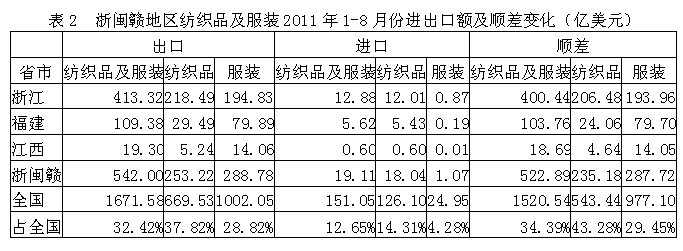 我國浙閩贛三省2011年1-8月份紡織品及服裝出口額為542.00億美元,占全國紡織品服裝出口總額的32.42%,其中紡織品出口額為253.22億美元,占全國37.82%,服裝出口額為288.78億美元,占全國28.82%;在進口方面,浙閩贛三省紡織品及服裝進口額為19.11億美元,占全國紡織品服裝進口總額的12.65%,其中紡織品進口額為18.04億美元,占全國14.31%,服裝進口額為1.07億美元,占全國4.28%;顯示我國浙閩贛地區(qū)紡織品服裝出口總額遠高于進口總額,順差明顯,表明該地區(qū)紡織品服裝在國際市場上競爭力較強。