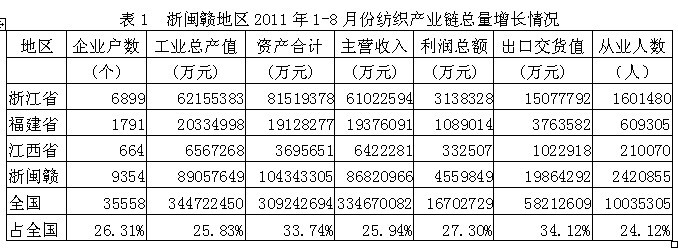 據(jù)國家統(tǒng)計局公布的數(shù)據(jù),2011年1-8月份我國浙閩贛三省(浙江省、福建省、江西省)紡織產(chǎn)業(yè)鏈(從紡織上游原料到下游服裝)規(guī)模以上企業(yè)數(shù)量為9354家,占全國總數(shù)的26.31%;工業(yè)總產(chǎn)值為8905.76億元,占25.83%;資產(chǎn)合計為10434.33億元,占33.74%;主營收入為8682.10億元,占25.94%;利潤總額為455.98億元,占27.30%;出口交貨值為1986.43億元,占34.12%;從業(yè)人數(shù)為242.09萬人,占24.12%。由此可見,浙閩贛地區(qū)紡織產(chǎn)業(yè)鏈總產(chǎn)值、總資產(chǎn)、主營收入、利潤總額、出口和就業(yè)均給全國作出了巨大的貢獻。