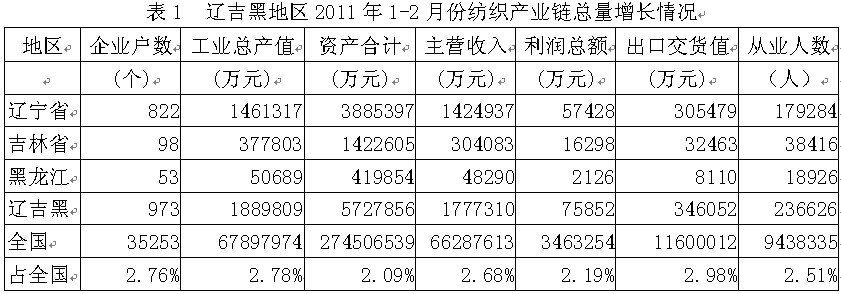 據(jù)國家統(tǒng)計(jì)局公布的數(shù)據(jù),2011年1-2月份我國遼吉黑三?。ㄟ|寧省、吉林省、黑龍江)紡織產(chǎn)業(yè)鏈(從紡織上游原料到下游服裝)規(guī)模以上企業(yè)數(shù)量為973家,占全國總數(shù)的2.76%;工業(yè)總產(chǎn)值為188.98億元,占2.78%;資產(chǎn)合計(jì)為572.79億元,占2.09%;主營收入為177.73億元,占2.68%;利潤總額為7.59億元,占2.19%;出口交貨值為34.61億元,占2.98%;從業(yè)人數(shù)為23.66萬人,占2.51%。由此可見,遼吉黑地區(qū)紡織產(chǎn)業(yè)鏈總產(chǎn)值、總資產(chǎn)、主營收入、出口和就業(yè)均給全國作出了一定的貢獻(xiàn)。