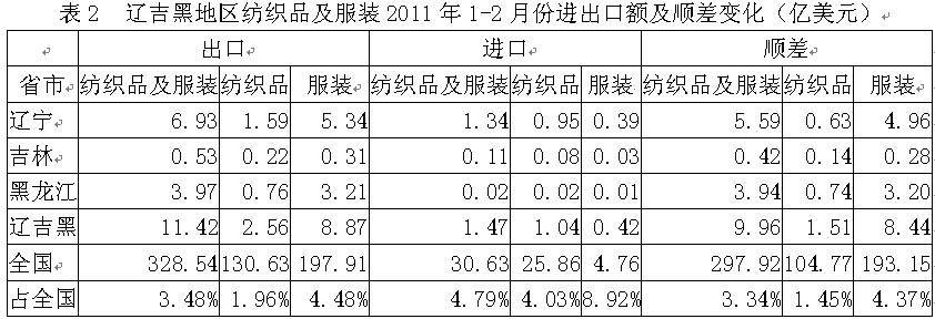 我國遼吉黑三省2011年1-2月份紡織品及服裝出口額為11.42億美元,占全國紡織品服裝出口總額的3.48%,其中紡織品出口額為2.56億美元,占全國1.96%,服裝出口額為8.87億美元,占全國4.48%;在進(jìn)口方面,遼吉黑三省紡織品及服裝進(jìn)口額為1.47億美元,占全國紡織品服裝進(jìn)口總額的4.79%,其中紡織品進(jìn)口額為1.04億美元,占全國4.03%,服裝進(jìn)口額為0.42億美元,占全國8.92%;顯示我國遼吉黑地區(qū)紡織品服裝出口總額遠(yuǎn)高于進(jìn)口總額,順差明顯,表明該地區(qū)紡織品服裝在國際市場上競爭力較強(qiáng)。