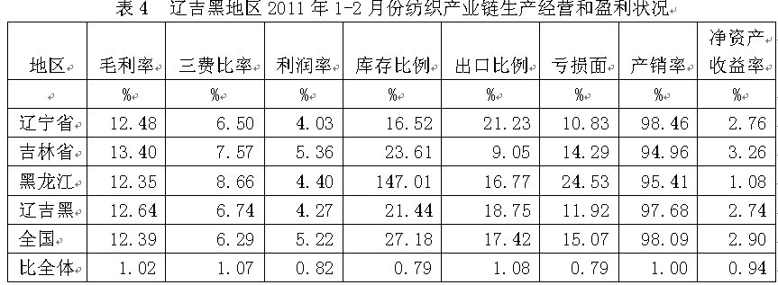 從生產(chǎn)經(jīng)營和盈利狀況看,遼吉黑紡織產(chǎn)業(yè)鏈毛利率2011年1-2月份為12.64%,為全國平均數(shù)的1.02倍,三費(fèi)比率(營業(yè)、管理和財(cái)務(wù)費(fèi)用率之和)為6.74%,為全國平均數(shù)的1.07倍,利潤率為4.27%,為全國平均數(shù)的0.82倍;庫存比率為21.44%,為全國平均數(shù)的0.79倍;出口比例為18.75%,為全國平均數(shù)的1.08倍;企業(yè)虧損面為11.92%,為全國平均數(shù)的0.79倍。由此可見,遼吉黑地區(qū)的盈利狀況接近于全國紡織產(chǎn)業(yè)鏈的平均水平。