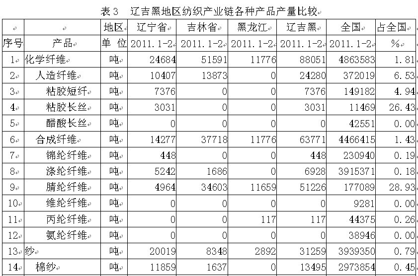 從紡織產(chǎn)業(yè)鏈各種產(chǎn)品的產(chǎn)量看,2011年1-2月份在遼吉黑三地,化學(xué)纖維產(chǎn)量為88051噸,占全國1.81%;人造纖維產(chǎn)量為24280噸,占全國6.53%;合成纖維產(chǎn)量為63771噸,占全國1.43%;其中滌綸產(chǎn)量為6928噸,占全國0.18%;紗產(chǎn)量為31259噸,占全國0.79%;布產(chǎn)量為7851萬米,占全國0.95%;印染布產(chǎn)量為1573萬米,占全國0.22%;簾子布產(chǎn)量為0噸,占全國0.00%;絲織品產(chǎn)量為78萬米,占全國0.90%;非織造布產(chǎn)量為12093噸,占全國5.29%;服裝產(chǎn)量為38720萬件,占全國7.69%;聚酯產(chǎn)量為60318噸,占全國3.19%。由此可見,遼吉黑三地各種產(chǎn)品為全國紡織產(chǎn)業(yè)鏈作出了一定的貢獻(xiàn)。