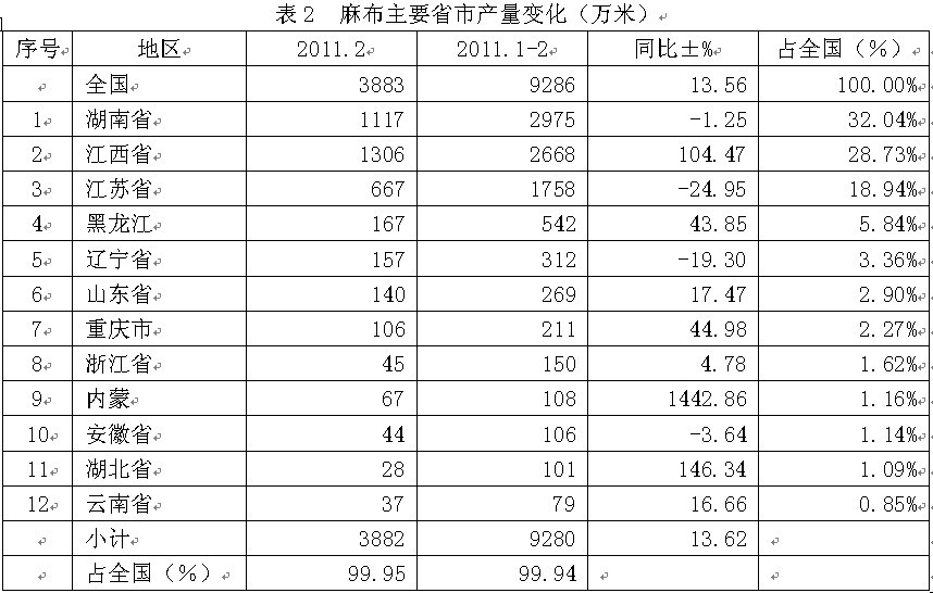 全國麻布2011年1-2月份產(chǎn)量合計(jì)為9286萬米,比上年同期增加13.56%;其中產(chǎn)量最大的省市是湖南省,產(chǎn)量為2975萬米,為省市龍頭;其次是江西省,產(chǎn)量2668萬米,位居亞軍;然后是江蘇省,產(chǎn)量1758萬米,榮立第三;黑龍江542萬米,為第四;遼寧省312萬米,占第五;山東省269萬米,位居第六;接下來是重慶市211萬米,為第七;浙江省150萬米,占第八;內(nèi)蒙108萬米,位居第九;安徽省106萬米,為第十名;湖北省101萬米,居第11名;云南省79萬米,榮立第12名。上述12大省市2011年1-2月份產(chǎn)量合計(jì)為9280萬米,占全國2011年1-2月份總產(chǎn)量的99.94%。