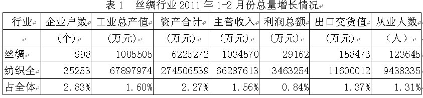 據(jù)國家統(tǒng)計局公布的數(shù)據(jù)(按往年慣例,1-2月份的經(jīng)濟指標數(shù)據(jù)合并在一起),2011年1-2月份我國規(guī)模以上(自2011年起,規(guī)模以上企業(yè)劃分標準調(diào)整為年主營業(yè)務(wù)收入2000萬元及以上工業(yè)法人企業(yè))絲綢行業(yè)企業(yè)數(shù)量為998家,占紡織全行業(yè)的2.83%;工業(yè)總產(chǎn)值為108.55億元,占1.60%;資產(chǎn)合計為622.53億元,占2.27%;主營收入為103.46億元,占1.56%;利潤總額為2.92億元,占0.84%;出口交貨值為15.85億元,占1.37%;從業(yè)人數(shù)為12.36萬人,占1.31%。由此可見,絲綢行業(yè)總產(chǎn)值、總資產(chǎn)、主營收入、利潤總額、出口和就業(yè)均給紡織全行業(yè)作出了一定的貢獻。