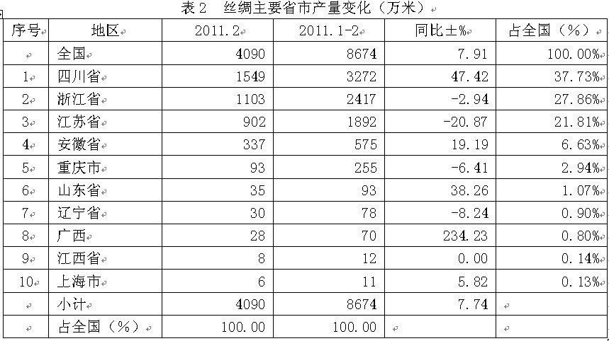 從2011年2月份的情況看,全國絲綢當月總產(chǎn)量為0.41億米,上述10大省市的當月產(chǎn)量合計為0.41億米,占全國當月總產(chǎn)量的100.00%;由此可見,我國前10大省市的絲綢產(chǎn)量約占全國總產(chǎn)量的全部。