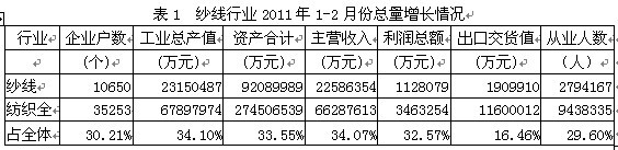 據(jù)國(guó)家統(tǒng)計(jì)局公布的數(shù)據(jù)(按往年慣例,1-2月份的經(jīng)濟(jì)指標(biāo)數(shù)據(jù)合并在一起),2011年1-2月份我國(guó)規(guī)模以上(自2011年起,規(guī)模以上企業(yè)劃分標(biāo)準(zhǔn)調(diào)整為年主營(yíng)業(yè)務(wù)收入2000萬(wàn)元及以上工業(yè)法人企業(yè))紗線行業(yè)企業(yè)數(shù)量為10650家,占紡織全行業(yè)的30.21%;工業(yè)總產(chǎn)值為2315.05億元,占34.10%;資產(chǎn)合計(jì)為9209.00億元,占33.55%;主營(yíng)收入為2258.64億元,占34.07%;利潤(rùn)總額為112.81億元,占32.57%;出口交貨值為190.99億元,占16.46%;從業(yè)人數(shù)為279.42萬(wàn)人,占29.60%。由此可見(jiàn),紗線行業(yè)總產(chǎn)值、總資產(chǎn)、主營(yíng)收入、利潤(rùn)總額、出口和就業(yè)均給紡織全行業(yè)作出了巨大的貢獻(xiàn)。
