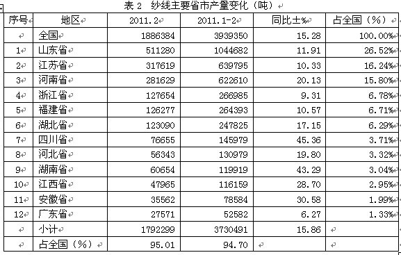 從2011年2月份的情況看,全國(guó)紗當(dāng)月總產(chǎn)量為188.64萬(wàn)噸,上述12大省市的當(dāng)月產(chǎn)量合計(jì)為179.23萬(wàn)噸,占全國(guó)當(dāng)月總產(chǎn)量的95.01%;由此可見(jiàn),我國(guó)前12大省市的紗產(chǎn)量約占全國(guó)總產(chǎn)量的絕大部分。