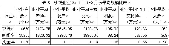 從企業(yè)平均規(guī)模的變化情況看,2011年1-2月份紗線企業(yè)平均產(chǎn)值為2174萬(wàn)元,為紡織全行業(yè)平均數(shù)的1.13倍;企業(yè)平均資產(chǎn)為8647萬(wàn)元,為行業(yè)平均數(shù)的1.11倍;企業(yè)平均主營(yíng)收入為2121萬(wàn)元,為行業(yè)平均數(shù)的1.13倍;企業(yè)平均利潤(rùn)為105.92萬(wàn)元,為行業(yè)平均數(shù)的1.08倍;企業(yè)平均出口交貨值為179.33萬(wàn)元,為行業(yè)平均數(shù)的0.55倍;企業(yè)平均人數(shù)為262人,為行業(yè)平均數(shù)的0.98倍。由此可見(jiàn),紗線企業(yè)的平均規(guī)模接近紡織全行業(yè)的平均水平,反映該行業(yè)大企業(yè)和優(yōu)質(zhì)產(chǎn)能占有一定的水平,行業(yè)的發(fā)展勢(shì)頭較為健康。