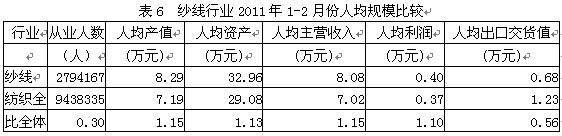 從行業(yè)人均規(guī)模的變化情況看,2011年1-2月份紗線行業(yè)人均產(chǎn)值為8.29萬(wàn)元,為紡織全行業(yè)平均數(shù)的1.15倍;人均資產(chǎn)為32.96萬(wàn)元,為行業(yè)平均數(shù)的1.13倍;人均主營(yíng)收入為8.08萬(wàn)元,為行業(yè)平均數(shù)的1.15倍;人均利潤(rùn)為0.40萬(wàn)元,為行業(yè)平均數(shù)的1.10倍;人均出口交貨值為0.68萬(wàn)元,為行業(yè)平均數(shù)的0.56倍。由此可見(jiàn),紗線行業(yè)的人均產(chǎn)值、人均資產(chǎn)、人均主營(yíng)收入、人均利潤(rùn)接近紡織全行業(yè)的平均數(shù),反映該行業(yè)勞動(dòng)生產(chǎn)率和綜合競(jìng)爭(zhēng)力相當(dāng)于全行業(yè)的平均水平,對(duì)全行業(yè)的貢獻(xiàn)較為可觀。