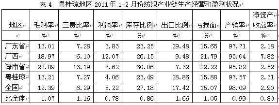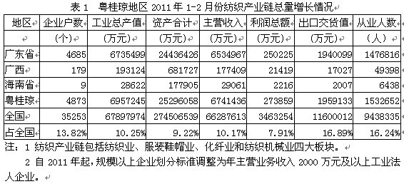 據(jù)國家統(tǒng)計局公布的數(shù)據(jù),2011年1-2月份我國粵桂瓊?cè)。◤V東省、廣西、海南?。┘徔棶a(chǎn)業(yè)鏈(從紡織上游原料到下游服裝)規(guī)模以上企業(yè)數(shù)量為4873家,占全國總數(shù)的13.82%;工業(yè)總產(chǎn)值為695.72億元,占10.25%;資產(chǎn)合計為2529.61億元,占9.22%;主營收入為674.14億元,占10.17%;利潤總額為27.39億元,占7.91%;出口交貨值為195.91億元,占16.89%;從業(yè)人數(shù)為153.27萬人,占16.24%。由此可見,粵桂瓊地區(qū)紡織產(chǎn)業(yè)鏈總產(chǎn)值、總資產(chǎn)、主營收入、利潤總額、出口和就業(yè)均給全國作出了較大的貢獻。