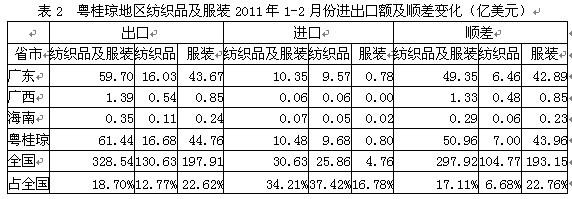 我國粵桂瓊?cè)?011年1-2月份紡織品及服裝出口額為61.44億美元,占全國紡織品服裝出口總額的18.70%,其中紡織品出口額為16.68億美元,占全國12.77%,服裝出口額為44.76億美元,占全國22.62%;在進口方面,粵桂瓊?cè)〖徔椘芳胺b進口額為10.48億美元,占全國紡織品服裝進口總額的34.21%,其中紡織品進口額為9.68億美元,占全國37.42%,服裝進口額為0.80億美元,占全國16.78%;顯示我國粵桂瓊地區(qū)紡織品服裝出口總額遠高于進口總額,順差明顯,表明該地區(qū)紡織品服裝在國際市場上競爭力較強。