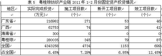 據(jù)國家統(tǒng)計局公布的數(shù)據(jù),2011年1-2月份粵桂瓊地區(qū)紡織產(chǎn)業(yè)鏈實際完成投資額28.00億元,占全國實際投資總額的6.45%;當年以來到目前為止施工項目總數(shù)為345個,占全國施工總數(shù)的7.29%;其中新開工項目數(shù)79個,占全國新開工項目總數(shù)的6.85%;截至2月底為止,已實現(xiàn)竣工項目數(shù)87個,占全國已竣工項目總數(shù)的12.45%,占該地區(qū)施工項目總數(shù)的25.22%,表明該地區(qū)投資項目進展較好。