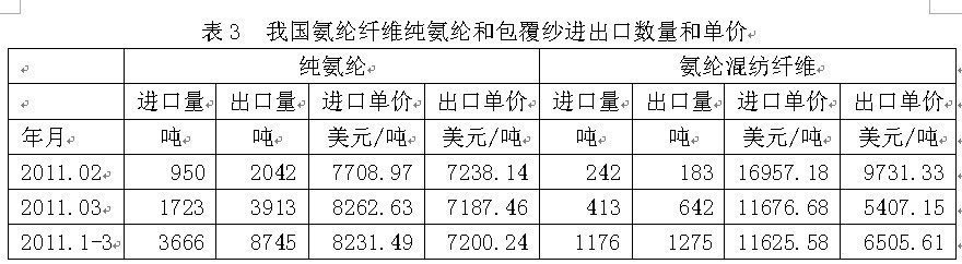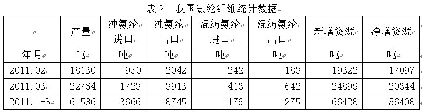 2氨綸纖維新增資源強(qiáng)勁 根據(jù)國家統(tǒng)計局和海關(guān)的統(tǒng)計數(shù)據(jù),我國2011年1-3月份氨綸纖維產(chǎn)量為6.16萬噸,同比減少0.23%;1-3月份進(jìn)口氨綸纖維純氨綸0.37萬噸,出口0.87萬噸;進(jìn)口氨綸混紡纖維0.12萬噸,出口0.13萬噸;新增資源(產(chǎn)量+純氨綸進(jìn)口+氨綸混紡纖維進(jìn)口)6.64萬噸,凈增資源(新增資源-純氨綸出口-氨綸混紡纖維出口,即表觀需求)5.64萬噸,顯示中國氨綸纖維產(chǎn)業(yè)的市場需求較為強(qiáng)勁。