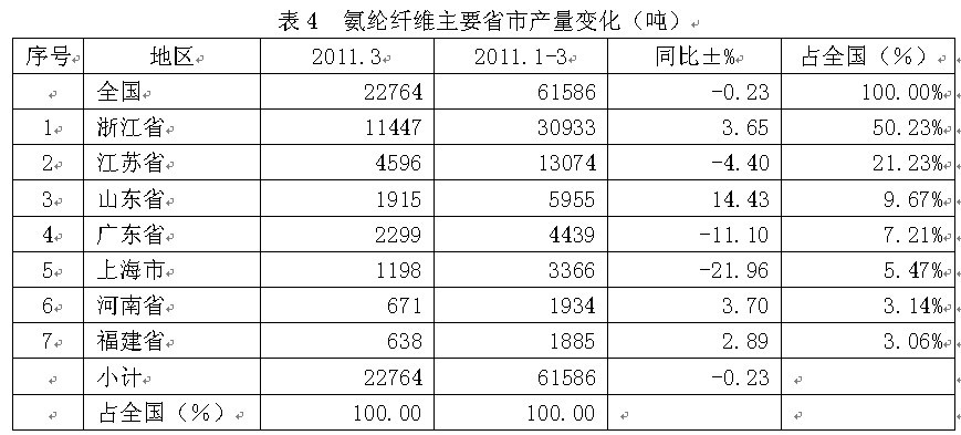 3氨綸纖維進(jìn)出口數(shù)量和單價 從我國氨綸纖維不同品種的進(jìn)出口情況看,2011年1-3月份氨綸纖維純氨綸進(jìn)口0.37萬噸,進(jìn)口單價8231.49美元/噸;出口0.87萬噸,出口單價7200.24美元/噸;氨綸混紡纖維進(jìn)口0.12萬噸,進(jìn)口單價11625.58美元/噸;出口0.13萬噸,出口單價6505.61美元/噸;表明我國氨綸纖維純氨綸和氨綸混紡纖維進(jìn)出口狀況良好。 4氨綸主要省市產(chǎn)量變化 全國氨綸2011年1-3月份產(chǎn)量合計為6.16萬噸,比上年同期減少0.23%;其中產(chǎn)量最大的省市是浙江省,產(chǎn)量為3.09萬噸,為省市龍頭;其次是江蘇省,產(chǎn)量1.31萬噸,位居亞軍;然后是山東省,產(chǎn)量0.60萬噸,榮立第三;廣東省0.44萬噸,為第四;上海市0.34萬噸,占第五;河南省0.19萬噸,位居第六;接下來是福建省0.19萬噸,為第七;上述7大省市2011年1-3月份產(chǎn)量合計為6.16萬噸,占全國2011年1-3月份總產(chǎn)量的100.00%。