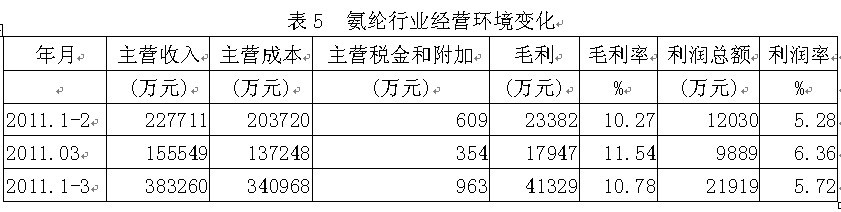 5氨綸行業(yè)經(jīng)營環(huán)境變化 2011年1-3月份我國氨綸行業(yè)產(chǎn)品主營收入為38.33億元,產(chǎn)品主營成本為34.10億元,產(chǎn)品主營稅金和附加為0.10億元,由此可計算出毛利(主營收入-主營成本-主營稅金和附加)為4.13億元,毛利率(毛利/主營收入)為10.78%;由于利潤總額為2.19億元,可算出利潤率(利潤總額/主營收入,即所得稅之前的利潤率,也稱稅前利潤率)為5.72%。經(jīng)營環(huán)境的變化直接影響主營成本,從而導(dǎo)致毛利和利潤總額出現(xiàn)相應(yīng)的變化。