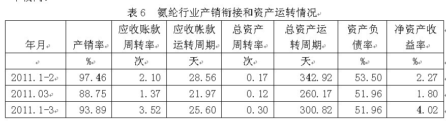 6氨綸行業(yè)產(chǎn)銷銜接和資產(chǎn)運(yùn)轉(zhuǎn)情況 從產(chǎn)銷銜接情況看,2011年1-3月份氨綸行業(yè)產(chǎn)銷率為93.89%,表明該行業(yè)產(chǎn)品銷售狀況較好;應(yīng)收賬款周轉(zhuǎn)率(主營收入/應(yīng)收賬款凈額)為3.52次;應(yīng)收賬款運(yùn)轉(zhuǎn)周期(90天/應(yīng)收賬款周轉(zhuǎn)率)為25.60天,應(yīng)收賬款周轉(zhuǎn)次數(shù)越多,或者應(yīng)收賬款周轉(zhuǎn)天數(shù)越少,表明其實現(xiàn)利潤的通道越加通暢。