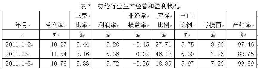 7氨綸行業(yè)生產(chǎn)經(jīng)營和盈利狀況 從企業(yè)生產(chǎn)經(jīng)營和盈利狀況看,氨綸行業(yè)毛利率2011年1-3月份為10.78%,三費(fèi)比率(營業(yè)、管理和財務(wù)費(fèi)用率之和)為5.33%,利潤率為5.72%,如果剔除非經(jīng)常性損益的影響,名義稅前利潤率為5.46%;該行業(yè)庫存比率為18.89%,表明產(chǎn)品銷售正常;出口比例為5.97%,表明出口狀況較好;該行業(yè)虧損面為7.26%。由此可見,在氨綸行業(yè)中,生產(chǎn)經(jīng)營狀況運(yùn)作得較好。