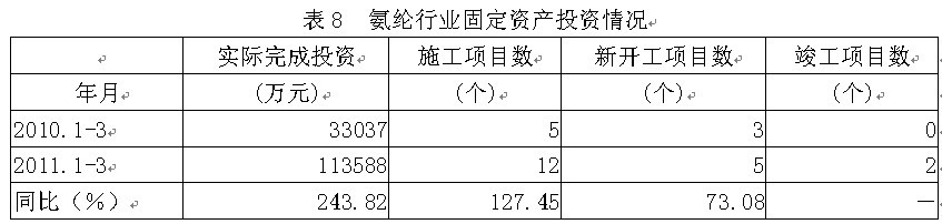 8氨綸行業(yè)固定資產(chǎn)投資情況 據(jù)國家統(tǒng)計局公布的數(shù)據(jù),2011年1-3月份氨綸行業(yè)實際完成投資額11.36億元,同比增加243.82%;當(dāng)年以來到目前為止施工項目總數(shù)為12個,同比增加127.45%;其中新開工項目數(shù)5個,同比增加73.08%;截至3月底為止,已實現(xiàn)竣工項目數(shù)2個,占施工項目總數(shù)的13.79%,表明該行業(yè)投資項目進(jìn)展較好。