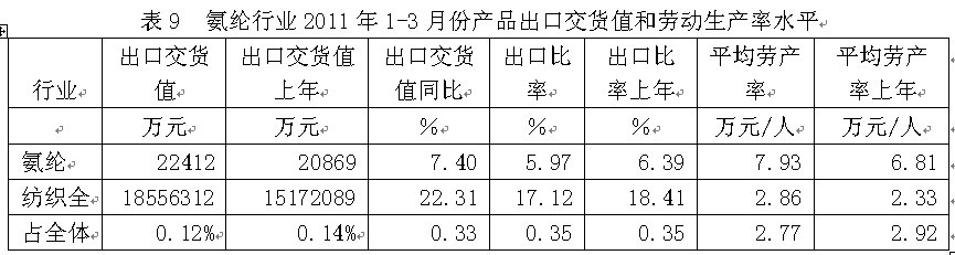 注:2011年固定資產(chǎn)投資數(shù)據(jù)統(tǒng)計范圍除了500萬元及以上城鎮(zhèn)項目以外,新添加農(nóng)村項目(不包括農(nóng)戶),但減去上年不足500萬元的幾個相同項目的打捆數(shù)據(jù),與上年統(tǒng)計數(shù)據(jù)口徑略有不同,故同比增長率數(shù)據(jù)僅供參考。 9氨綸行業(yè)產(chǎn)品出口交貨值和勞動生產(chǎn)率水平 從行業(yè)產(chǎn)品出口交貨值和勞動生產(chǎn)率水平看,2011年1-3月份氨綸行業(yè)產(chǎn)品出口交貨值為2.24億元,占紡織全行業(yè)的0.12%;出口交貨值比上年同期增加7.40%;該行業(yè)產(chǎn)品出口比率(出口交貨值/工業(yè)銷售產(chǎn)值)為5.97%,而上年同期為6.39%,表明該行業(yè)產(chǎn)品出口狀況較好;從勞動生產(chǎn)率的水平看,2011年1-3月份氨綸行業(yè)平均勞產(chǎn)率(工業(yè)增加值/從業(yè)人數(shù))為7.93萬元/人,而上年同期為6.81萬元/人,表明該行業(yè)勞動生產(chǎn)率的實際水平較為理想。