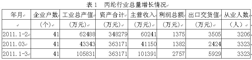 1丙綸行業(yè)總量增長情況 據(jù)國家統(tǒng)計局公布的數(shù)據(jù),2011年1-3月份我國規(guī)模以上丙綸行業(yè)上下游企業(yè)數(shù)量為41家,該行業(yè)實現(xiàn)工業(yè)總產(chǎn)值10.58億元,同比增加19.63%;資產(chǎn)合計36.32億元,同比增加18.62%;實現(xiàn)主營收入10.14億元,同比增加16.69%;完成利潤總額0.28億元,比上年同期減少0.441億元,同比減少5.69%;完成出口交貨值0.59億元,同比增加7.40%;行業(yè)整體從業(yè)人數(shù)0.33萬人,同比增加2.79%。由此可見,丙綸行業(yè)總量增長勢頭良好,并為我國經(jīng)濟、財政、出口和就業(yè)作出了重大的貢獻。