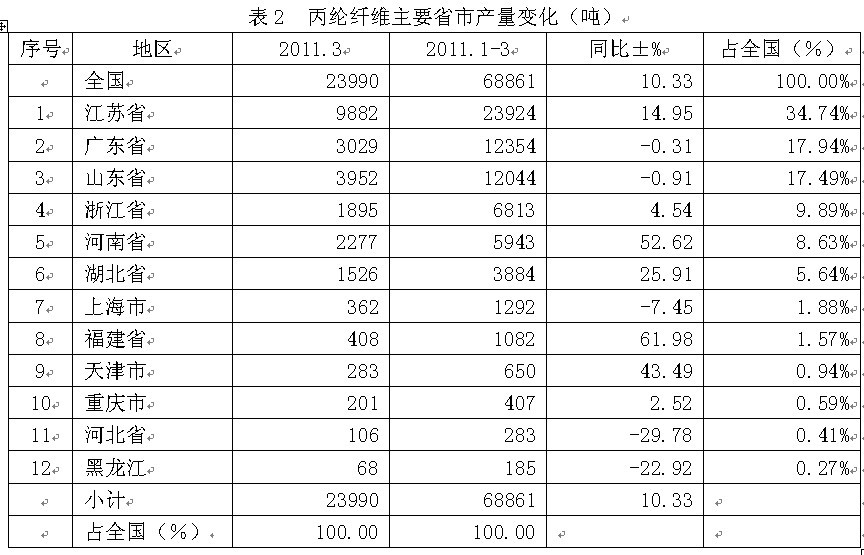2丙綸纖維主要省市產(chǎn)量變化 全國丙綸纖維2011年1-3月份產(chǎn)量合計為6.89萬噸,比上年同期增加10.33%;其中產(chǎn)量最大的省市是江蘇省,產(chǎn)量為2.39萬噸,為省市龍頭;其次是廣東省,產(chǎn)量1.24萬噸,位居亞軍;然后是山東省,產(chǎn)量1.20萬噸,榮立第三;浙江省0.68萬噸,為第四;河南省0.59萬噸,占第五;湖北省0.39萬噸,位居第六;接下來是上海市0.13萬噸,為第七;福建省0.11萬噸,占第八;天津市0.07萬噸,位居第九;重慶市0.04萬噸,為第十名;河北省0.03萬噸,居第11名;黑龍江0.02萬噸,榮立第12名。上述12大省市2011年1-3月份產(chǎn)量合計為6.89萬噸,占全國2011年1-3月份總產(chǎn)量的100.00%。