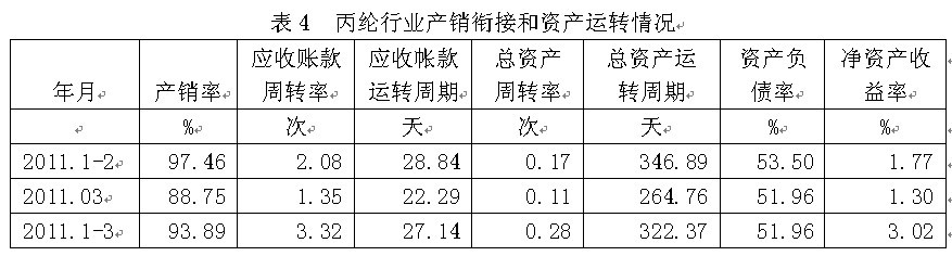 4丙綸行業(yè)產(chǎn)銷銜接和資產(chǎn)運轉(zhuǎn)情況 從產(chǎn)銷銜接情況看,2011年1-3月份丙綸行業(yè)產(chǎn)銷率為93.89%,表明該行業(yè)產(chǎn)品銷售狀況較好;應收賬款周轉(zhuǎn)率(主營收入/應收賬款凈額)為3.32次;應收賬款運轉(zhuǎn)周期(90天/應收賬款周轉(zhuǎn)率)為27.14天,應收賬款周轉(zhuǎn)次數(shù)越多,或者應收賬款周轉(zhuǎn)天數(shù)越少,表明其實現(xiàn)利潤的通道越加通暢。從資產(chǎn)運轉(zhuǎn)情況看,丙綸行業(yè)總資產(chǎn)周轉(zhuǎn)率(主營收入/資產(chǎn)合計)2011年1-3月份為0.28次,總資產(chǎn)運轉(zhuǎn)周期(90天/總資產(chǎn)周轉(zhuǎn)率)為322.37天,總資產(chǎn)周轉(zhuǎn)次數(shù)越多,或者總資產(chǎn)周轉(zhuǎn)天數(shù)越少,表明資產(chǎn)利用效率越高。丙綸行業(yè)資產(chǎn)負債率2011年1-3月份為51.96%,表明財務政策的運作較為穩(wěn)??;凈資產(chǎn)收益率為3.02%,表明該行業(yè)凈資產(chǎn)運作效率較高。