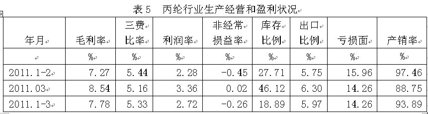 5丙綸行業(yè)生產(chǎn)經(jīng)營和盈利狀況 從企業(yè)生產(chǎn)經(jīng)營和盈利狀況看,丙綸行業(yè)毛利率2011年1-3月份為7.78%,三費比率(營業(yè)、管理和財務費用率之和)為5.33%,利潤率為2.72%,如果剔除非經(jīng)常性損益的影響,名義稅前利潤率為2.46%;該行業(yè)庫存比率為18.89%,表明產(chǎn)品銷售正常;出口比例為5.97%,表明出口狀況較好;該行業(yè)虧損面為14.26%。由此可見,在丙綸行業(yè)中,生產(chǎn)經(jīng)營狀況運作得較好。