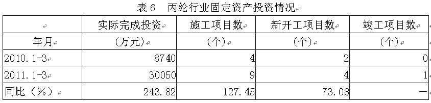 6丙綸行業(yè)固定資產(chǎn)投資情況 據(jù)國家統(tǒng)計局公布的數(shù)據(jù),2011年1-3月份丙綸行業(yè)實際完成投資額3.00億元,同比增加243.82%;當年以來到目前為止施工項目總數(shù)為9個,同比增加127.45%;其中新開工項目數(shù)4個,同比增加73.08%;截至3月底為止,已實現(xiàn)竣工項目數(shù)1個,占施工項目總數(shù)的13.79%,表明該行業(yè)投資項目進展較好。