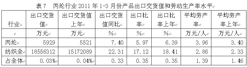 7丙綸行業(yè)產(chǎn)品出口交貨值和勞動生產(chǎn)率水平 從行業(yè)產(chǎn)品出口交貨值和勞動生產(chǎn)率水平看,2011年1-3月份丙綸行業(yè)產(chǎn)品出口交貨值為0.59億元,占紡織全行業(yè)的0.03%;出口交貨值比上年同期增加7.40%;該行業(yè)產(chǎn)品出口比率(出口交貨值/工業(yè)銷售產(chǎn)值)為5.97%,而上年同期為6.39%,表明該行業(yè)產(chǎn)品出口狀況較好;從勞動生產(chǎn)率的水平看,2011年1-3月份丙綸行業(yè)平均勞產(chǎn)率(工業(yè)增加值/從業(yè)人數(shù))為3.96萬元/人,而上年同期為3.40萬元/人,表明該行業(yè)勞動生產(chǎn)率的實際水平較為理想。