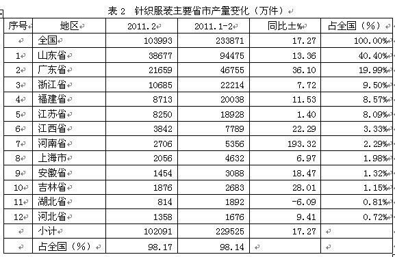 從2011年2月份的情況看,全國針織服裝當(dāng)月總產(chǎn)量為10.40億件,上述12大省市的當(dāng)月產(chǎn)量合計(jì)為10.21億件,占全國當(dāng)月總產(chǎn)量的98.17%;由此可見,我國前12大省市的針織服裝產(chǎn)量約占全國總產(chǎn)量的絕大部分。