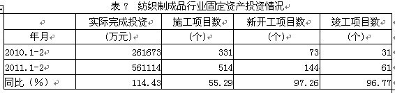 據(jù)國(guó)家統(tǒng)計(jì)局公布的數(shù)據(jù),2011年1-2月份紡織制成品行業(yè)實(shí)際完成投資額56.11億元,同比增加114.43%;當(dāng)年以來(lái)到目前為止施工項(xiàng)目總數(shù)為514個(gè),同比增加55.29%;其中新開(kāi)工項(xiàng)目數(shù)144個(gè),同比增加97.26%;截至2月底為止,已實(shí)現(xiàn)竣工項(xiàng)目數(shù)61個(gè),同比增加96.77%,占施工項(xiàng)目總數(shù)的11.87%,表明該行業(yè)投資項(xiàng)目進(jìn)展較好。