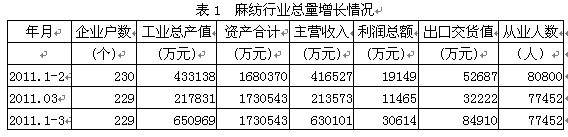 據(jù)國(guó)家統(tǒng)計(jì)局公布的數(shù)據(jù),2011年1-3月份我國(guó)規(guī)模以上麻紡行業(yè)企業(yè)數(shù)量為229家,該行業(yè)實(shí)現(xiàn)工業(yè)總產(chǎn)值65.10億元,同比增加45.19%;資產(chǎn)合計(jì)173.05億元,同比增加8.83%;實(shí)現(xiàn)主營(yíng)收入63.01億元,同比增加42.53%;完成利潤(rùn)總額3.06億元,比上年同期增加1.46億元,同比增加90.72%;完成出口交貨值8.5億元,同比增加47.09%;行業(yè)整體從業(yè)人數(shù)7.75萬(wàn)人,同比增加7.90%。由此可見,麻紡行業(yè)總量增長(zhǎng)勢(shì)頭良好,并為我國(guó)經(jīng)濟(jì)、財(cái)政、出口和就業(yè)作出了重大的貢獻(xiàn)。