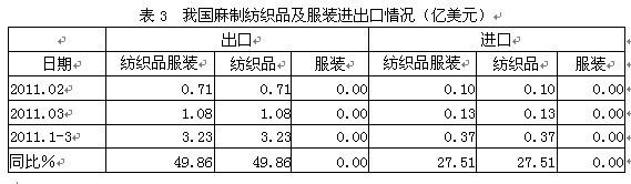 根據(jù)中國(guó)海關(guān)的統(tǒng)計(jì)數(shù)據(jù),我國(guó)2011年1-3月份麻制紡織品及服裝出口總額3.23億美元,同比增加49.86%,占紡織品及服裝出口總額498.66億美元的0.65%;其中1-3月份麻制紡織品出口總額3.23億美元,同比增加49.86%,占紡織品出口總額214.05億美元的1.51%;