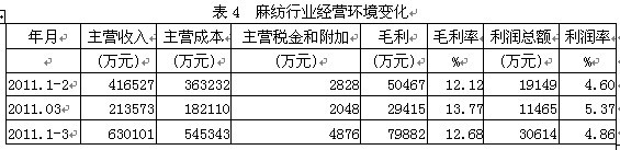 2011年1-3月份我國(guó)麻紡行業(yè)產(chǎn)品主營(yíng)收入為63.01億元,產(chǎn)品主營(yíng)成本為54.53億元,產(chǎn)品主營(yíng)稅金和附加為0.49億元,由此可計(jì)算出毛利(主營(yíng)收入-主營(yíng)成本-主營(yíng)稅金和附加)為7.99億元,毛利率(毛利/主營(yíng)收入)為12.68%;由于利潤(rùn)總額為3.06億元,可算出利潤(rùn)率(利潤(rùn)總額/主營(yíng)收入,即所得稅之前的利潤(rùn)率,也稱稅前利潤(rùn)率)為4.86%。經(jīng)營(yíng)環(huán)境的變化直接影響主營(yíng)成本,從而導(dǎo)致毛利和利潤(rùn)總額出現(xiàn)相應(yīng)的變化。