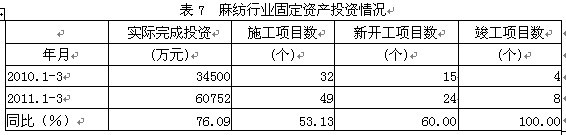 據(jù)國(guó)家統(tǒng)計(jì)局公布的數(shù)據(jù),2011年1-3月份麻紡行業(yè)實(shí)際完成投資額6.08億元,同比增加76.09%;當(dāng)年以來(lái)到目前為止施工項(xiàng)目總數(shù)為49個(gè),同比增加53.13%;其中新開工項(xiàng)目數(shù)24個(gè),同比增加60.00%;截至3月底為止,已實(shí)現(xiàn)竣工項(xiàng)目數(shù)8個(gè),同比增加100.00%,占施工項(xiàng)目總數(shù)的16.33%,表明該行業(yè)投資項(xiàng)目進(jìn)展較好。