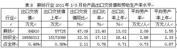 從行業(yè)產(chǎn)品出口交貨值和勞動(dòng)生產(chǎn)率水平看,2011年1-3月份麻紡行業(yè)產(chǎn)品出口交貨值為8.49億元,占紡織全行業(yè)的0.46%;出口交貨值比上年同期增加47.09%;該行業(yè)產(chǎn)品出口比率(出口交貨值/工業(yè)銷售產(chǎn)值)為13.40%,而上年同期為13.02%,表明該行業(yè)產(chǎn)品出口狀況較好;從勞動(dòng)生產(chǎn)率的水平看,2011年1-3月份麻紡行業(yè)平均勞產(chǎn)率(工業(yè)增加值/從業(yè)人數(shù))為2.09萬(wàn)元/人,而上年同期為1.55萬(wàn)元/人,表明該行業(yè)勞動(dòng)生產(chǎn)率的實(shí)際水平較為理想。