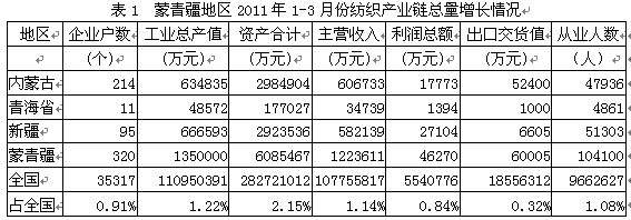 據(jù)國(guó)家統(tǒng)計(jì)局公布的數(shù)據(jù),2011年1-3月份我國(guó)蒙青疆三?。▋?nèi)蒙古、青海省、新疆)紡織產(chǎn)業(yè)鏈(從紡織上游原料到下游服裝)規(guī)模以上企業(yè)數(shù)量為320家,占全國(guó)總數(shù)的0.91%;工業(yè)總產(chǎn)值為135.00億元,占1.22%;資產(chǎn)合計(jì)為608.55億元,占2.15%;主營(yíng)收入為122.36億元,占1.14%;利潤(rùn)總額為4.63億元,占0.84%;出口交貨值為6.00億元,占0.32%;從業(yè)人數(shù)為10.41萬(wàn)人,占1.08%。由此可見(jiàn),蒙青疆地區(qū)紡織產(chǎn)業(yè)鏈總產(chǎn)值、總資產(chǎn)、主營(yíng)收入、利潤(rùn)總額、出口和就業(yè)均給全國(guó)作出了一定的貢獻(xiàn)。