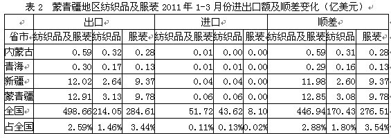 我國(guó)蒙青疆三省2011年1-3月份紡織品及服裝出口額為12.91億美元,占全國(guó)紡織品服裝出口總額的2.59%,其中紡織品出口額為3.13億美元,占全國(guó)1.46%,服裝出口額為9.78億美元,占全國(guó)3.44%;在進(jìn)口方面,蒙青疆三省紡織品及服裝進(jìn)口額為0.06億美元,占全國(guó)紡織品服裝進(jìn)口總額的0.11%,其中紡織品進(jìn)口額為0.06億美元,占全國(guó)0.13%,服裝進(jìn)口額為0.001億美元,占全國(guó)0.02%;顯示我國(guó)蒙青疆地區(qū)紡織品服裝出口總額遠(yuǎn)高于進(jìn)口總額,順差明顯,表明該地區(qū)紡織品服裝在國(guó)際市場(chǎng)上競(jìng)爭(zhēng)力較強(qiáng)。