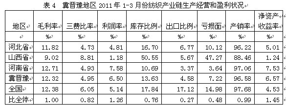 從生產(chǎn)經(jīng)營(yíng)和盈利狀況看,冀晉豫紡織產(chǎn)業(yè)鏈毛利率2011年1-3月份為12.32%,為全國(guó)平均數(shù)的1.00倍,三費(fèi)比率(營(yíng)業(yè)、管理和財(cái)務(wù)費(fèi)用率之和)為4.95%,為全國(guó)平均數(shù)的0.82倍,利潤(rùn)率為6.50%,為全國(guó)平均數(shù)的1.26倍;庫(kù)存比率為13.63%,為全國(guó)平均數(shù)的0.76倍;出口比例為4.58%,為全國(guó)平均數(shù)的0.27倍;企業(yè)虧損面為7.22%,為全國(guó)平均數(shù)的0.48倍。由此可見(jiàn),冀晉豫地區(qū)的盈利狀況接近于全國(guó)紡織產(chǎn)業(yè)鏈的平均水平。