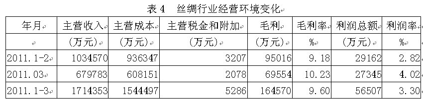 2011年1-3月份我國(guó)絲綢行業(yè)產(chǎn)品主營(yíng)收入為171.44億元,產(chǎn)品主營(yíng)成本為154.45億元,產(chǎn)品主營(yíng)稅金和附加為0.53億元,由此可計(jì)算出毛利(主營(yíng)收入-主營(yíng)成本-主營(yíng)稅金和附加)為16.46億元,毛利率(毛利/主營(yíng)收入)為9.60%;由于利潤(rùn)總額為5.65億元,可算出利潤(rùn)率(利潤(rùn)總額/主營(yíng)收入,即所得稅之前的利潤(rùn)率,也稱稅前利潤(rùn)率)為3.30%。經(jīng)營(yíng)環(huán)境的變化直接影響主營(yíng)成本,從而導(dǎo)致毛利和利潤(rùn)總額出現(xiàn)相應(yīng)的變化。