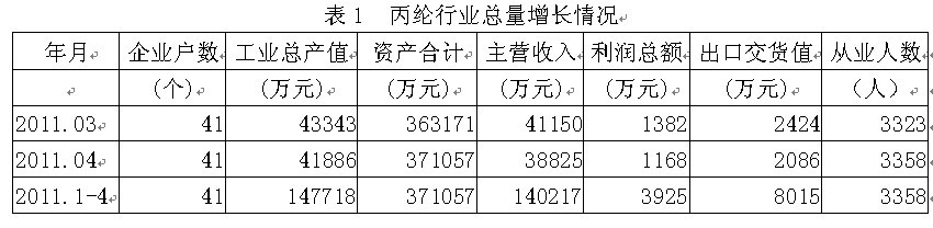 據(jù)國(guó)家統(tǒng)計(jì)局公布的數(shù)據(jù),2011年1-4月份我國(guó)規(guī)模以上丙綸行業(yè)上下游企業(yè)數(shù)量為41家,該行業(yè)實(shí)現(xiàn)工業(yè)總產(chǎn)值14.77億元,同比增加18.71%;資產(chǎn)合計(jì)37.11億元,同比增加18.17%;實(shí)現(xiàn)主營(yíng)收入14.02億元,同比增加15.76%;完成利潤(rùn)總額0.39億元,比上年同期減少1.592億元,同比減少13.45%;完成出口交貨值0.80億元,同比增加7.52%;行業(yè)整體從業(yè)人數(shù)0.34萬(wàn)人,同比增加3.35%。由此可見,丙綸行業(yè)總量增長(zhǎng)勢(shì)頭良好,并為我國(guó)經(jīng)濟(jì)、財(cái)政、出口和就業(yè)作出了重大的貢獻(xiàn)。