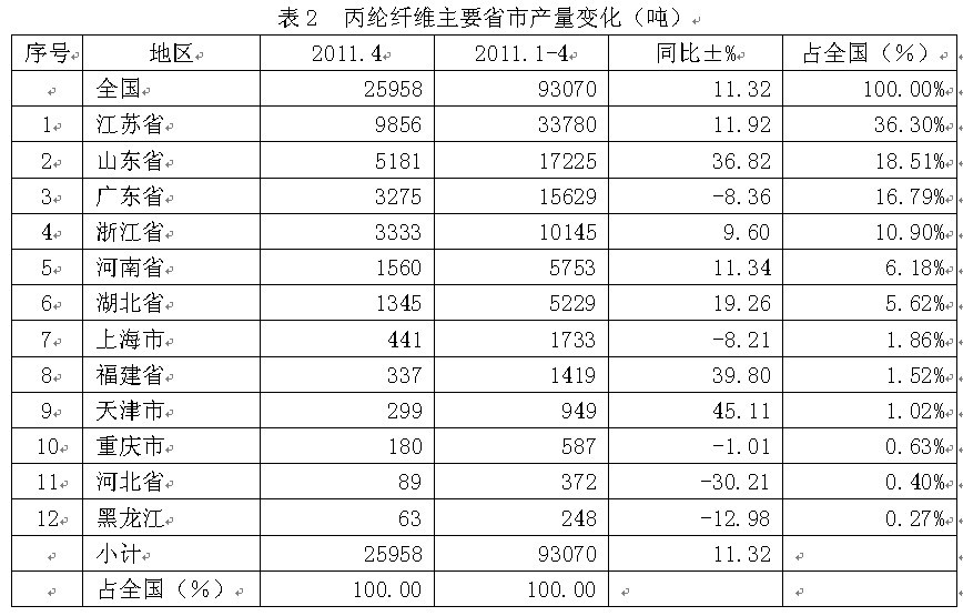 全國(guó)丙綸纖維2011年1-4月份產(chǎn)量合計(jì)為9.31萬(wàn)噸,比上年同期增加11.32%;其中產(chǎn)量最大的省市是江蘇省,產(chǎn)量為3.38萬(wàn)噸,為省市龍頭;其次是山東省,產(chǎn)量1.72萬(wàn)噸,位居亞軍;然后是廣東省,產(chǎn)量1.56萬(wàn)噸,榮立第三;浙江省1.01萬(wàn)噸,為第四;河南省0.58萬(wàn)噸,占第五;湖北省0.52萬(wàn)噸,位居第六;接下來(lái)是上海市0.17萬(wàn)噸,為第七;福建省0.14萬(wàn)噸,占第八;天津市0.09萬(wàn)噸,位居第九;重慶市0.06萬(wàn)噸,為第十名;河北省0.04萬(wàn)噸,居第11名;黑龍江0.02萬(wàn)噸,榮立第12名。上述12大省市2011年1-4月份產(chǎn)量合計(jì)為9.31萬(wàn)噸,占全國(guó)2011年1-4月份總產(chǎn)量的100.00%。